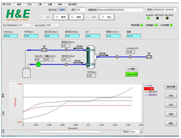 2)可設(shè)置進(jìn)料壓力、TMP及透過(guò)端UV報(bào)警值,超出范圍即停泵,防止目標(biāo)物損失,保證工藝可控性。
